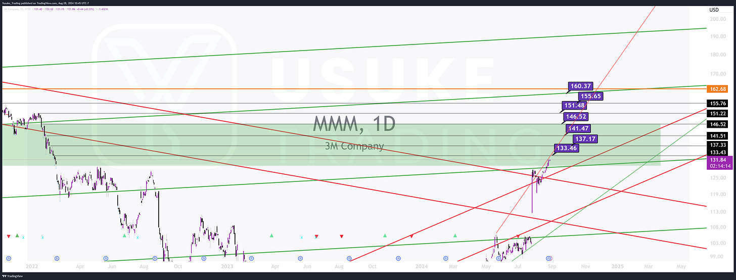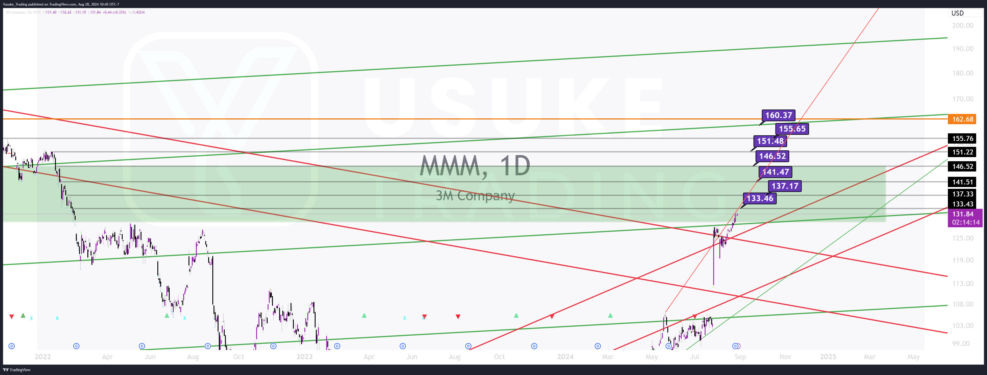 - On a larger timeframe, MMM has been in a downtrend but is showing signs of reversal.